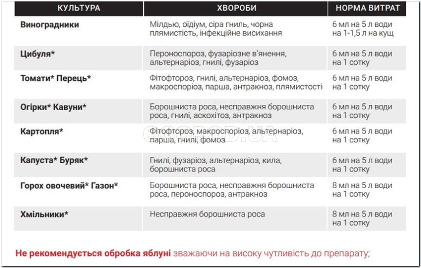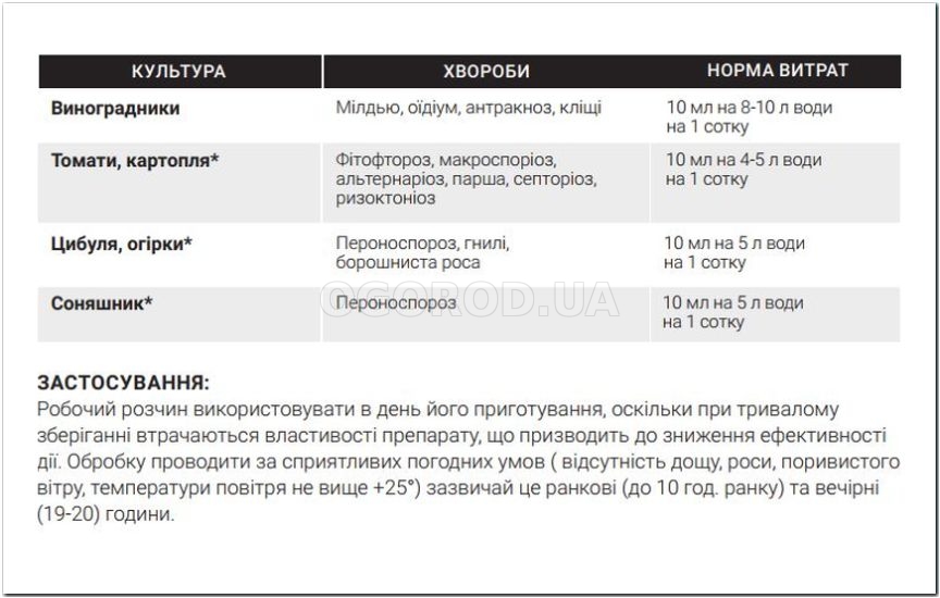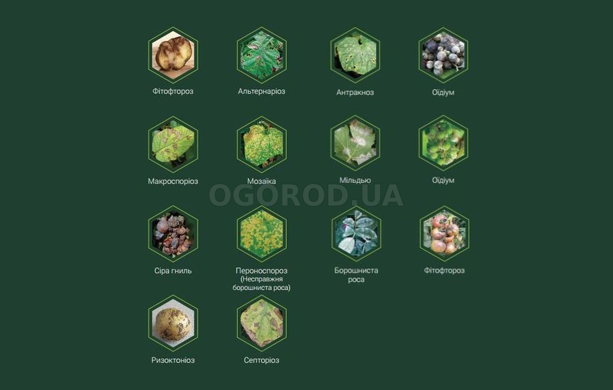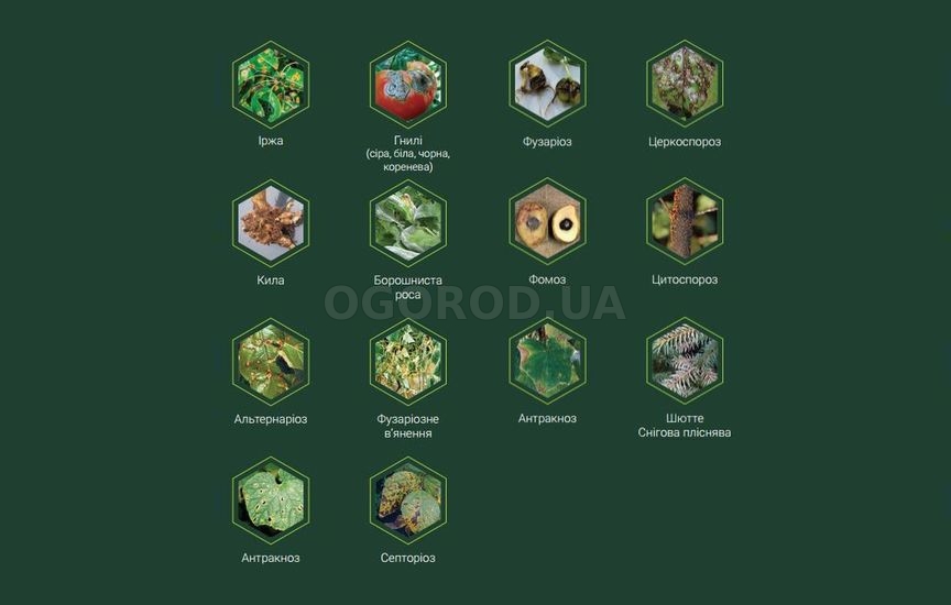 Спектр действия: мучнистая роса, белая гниль донца, шейковая гниль, фузариозная гниль, зеленая плесень чеснока, ложная мучнистая роса, парша, фузариоз, ржавчина, септориоз, фомоз, ринхоспориоз, гниль, переноспороз, пятнистости, альтернариоз, полосатая и сетчатая пятнистость.
