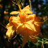 Цветение начинается в конце мая и продолжается до начала июня. В течение трёх недель куст покрывается крупными цветками диаметром 6–8 см, собранными в пышные соцветия по 8–15 штук. Их огненно-жёлтая окраска с апельсиновыми и медными оттенками особенно выразительна на фоне тёмной листвы. Цветки нежно ароматные, что добавляет растению ещё больше очарования.