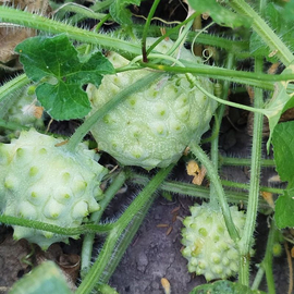 Это редкий наследственный сорт Cucumis metuliferus почти сферической формы с ярко‑оранжевой шиповатой кожурой и желеобразной зелёной мякотью, отличающийся освежающим вкусом с нотами банана, лайма и огурца и ценящийся за декоративность.