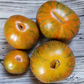 Среднеспелый, высокий, высокоурожайный сорт, плоды округло-плоские, оранжево-красные, очень плотные, массой 200-500 грамм, внутри тоже оранжево-красные, мраморные, очень красивые, сорт дает много крупных плодов отменного качества и великолепного вкуса.