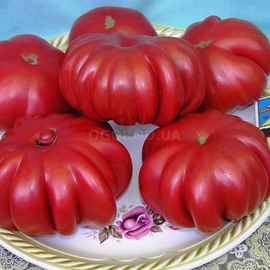 Оригинальный среднеспелый, крупноплодный сорт с экстравагантной формой плодов, куст крепкий, высотой 80-90 см, с 3-4 яркими красными крупными мясистыми плодами массой 250-350 грамм, плоды плоские, с ярко выраженной ребристостью, с нежной мякотью.